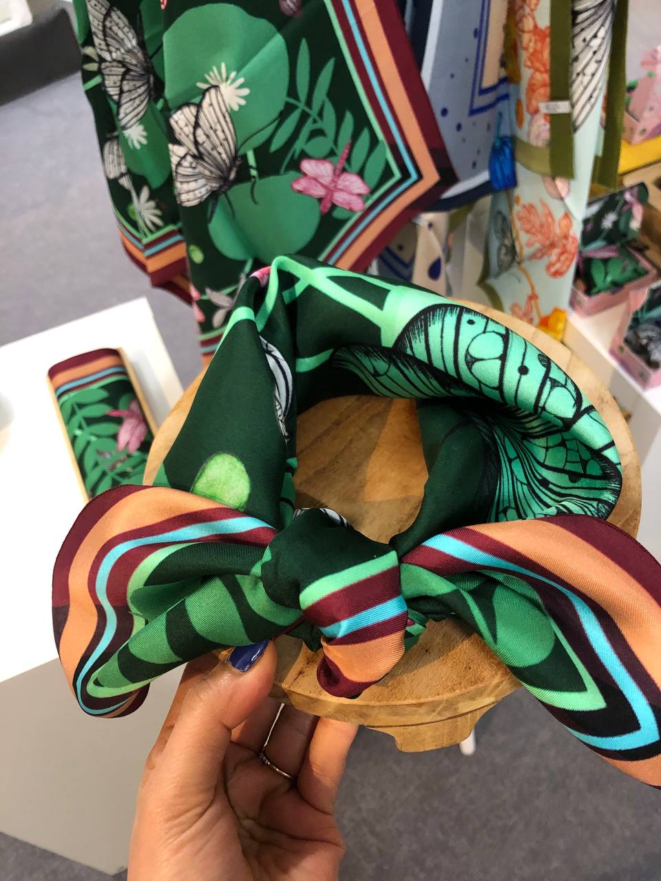 Chaque foulard est inspiré par la nature morte, les fleurs, les feuilles, les arbres, les lignes et les formes, évoquant le mouvement, la transformation et l’imagination dans un univers floral poétique.